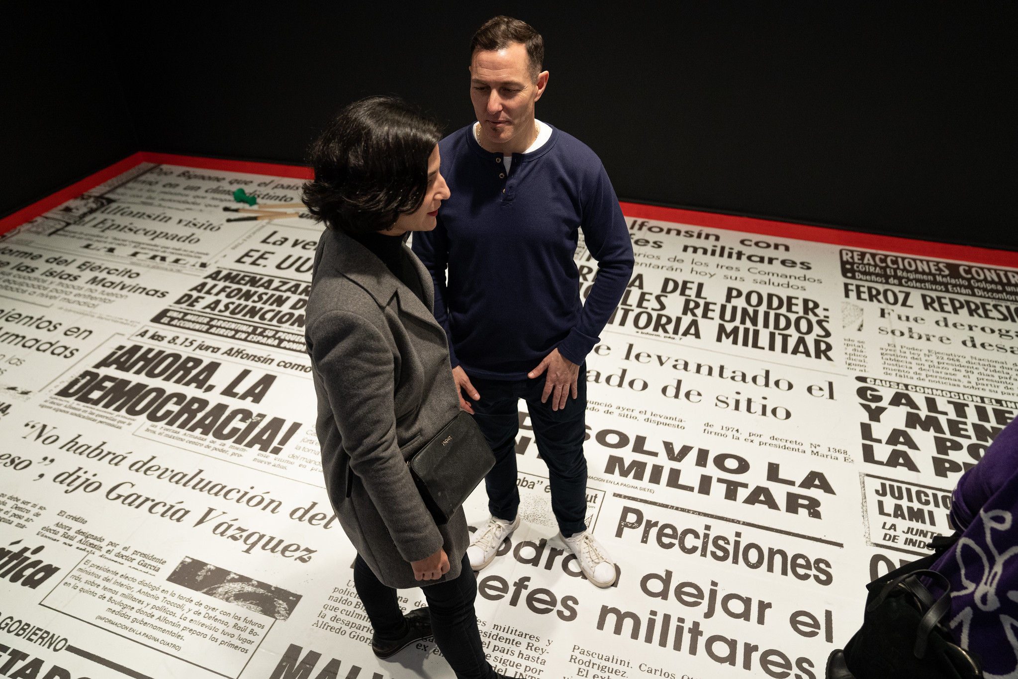 En las salas 702, 703, 704, 705, 706 del piso 7 del CCK se puede ver un suelo completo de titulares de diarios, una pantalla gigante con zócalos de noticieros, teléfonos que suenan en instalaciones participativas. También, hay imágenes emblemáticas de la televisión, diarios y los distintos medios de comunicación. Entre otras intervenciones artísticas que invitan a repensar los mensajes que circulan en ellos.