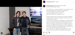 “Mi viejo camarada, recién te me fuiste y ya te estoy extrañando mucho. Tengo un nudo en el estómago, que estoy consciente que tardará mucho en irse”, escribió Gebel en su publicación. “Lo único que me produce una profunda paz, es que hace apenas unos días, tu último viaje fue a Los Ángeles, solo para vernos y pasar unos días juntos. Guitarreamos, nos abrazamos mucho, comimos unos regios asados al carbón, recordamos viejas giras, tomamos unos Malbec extraordinarios, nos reímos, cantamos…”